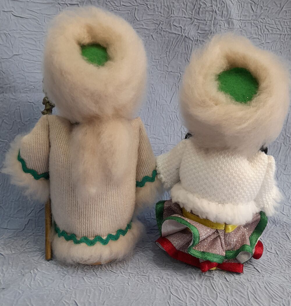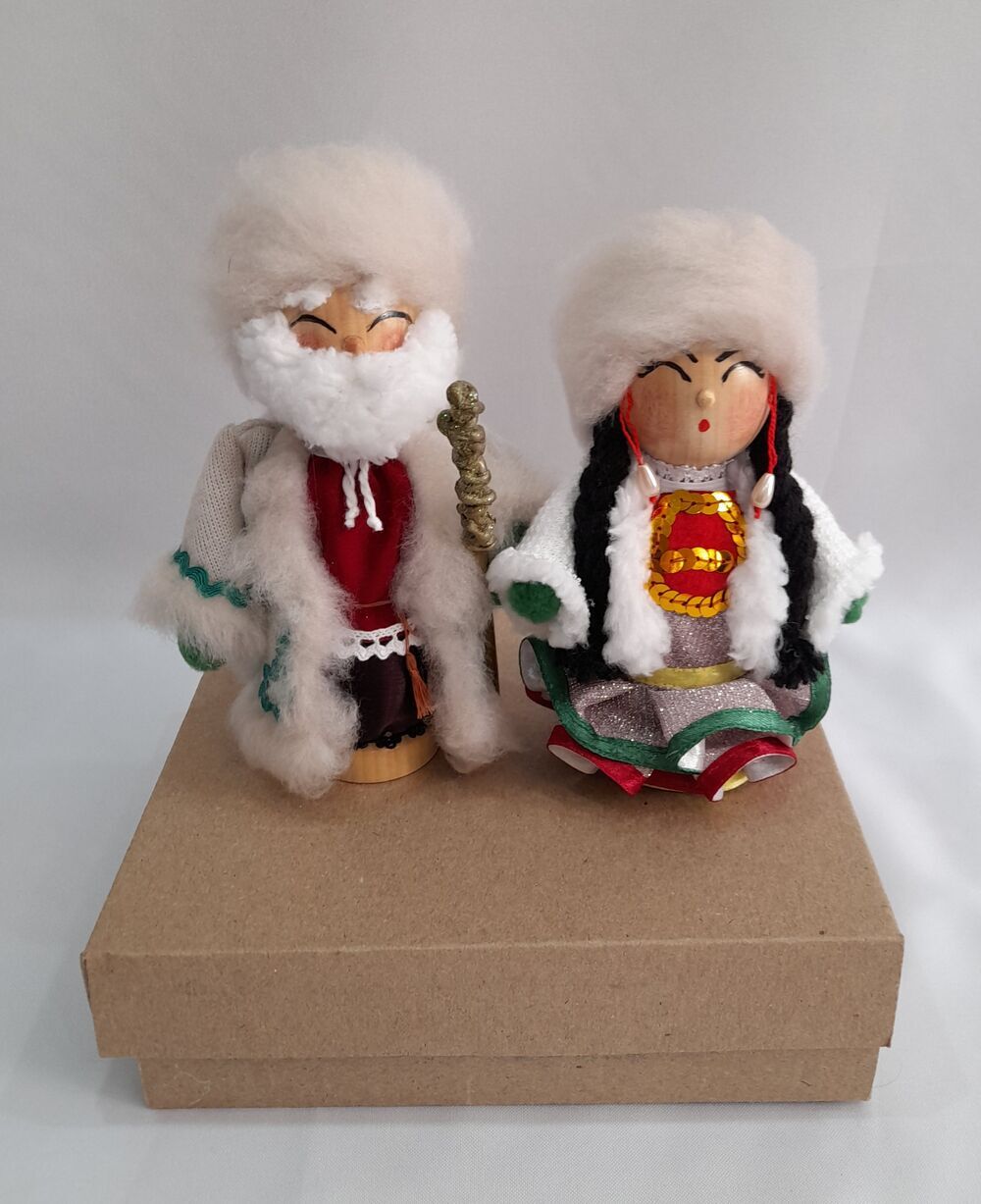 В набор входит две сувенирные куклы. Высота 16 см. Основа дерево. Прилагается коробка, описание. Сувенир символизирует башкирского деда мороза и снегурочка.